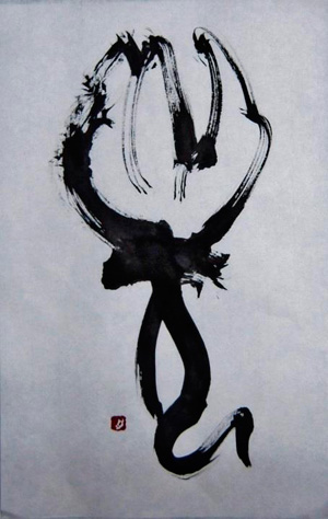 「生命力・命」古代のロマンを頭に浮かべながら、そのイメージを自分流に拡げて大きな和紙に一気に筆を走らせます。
